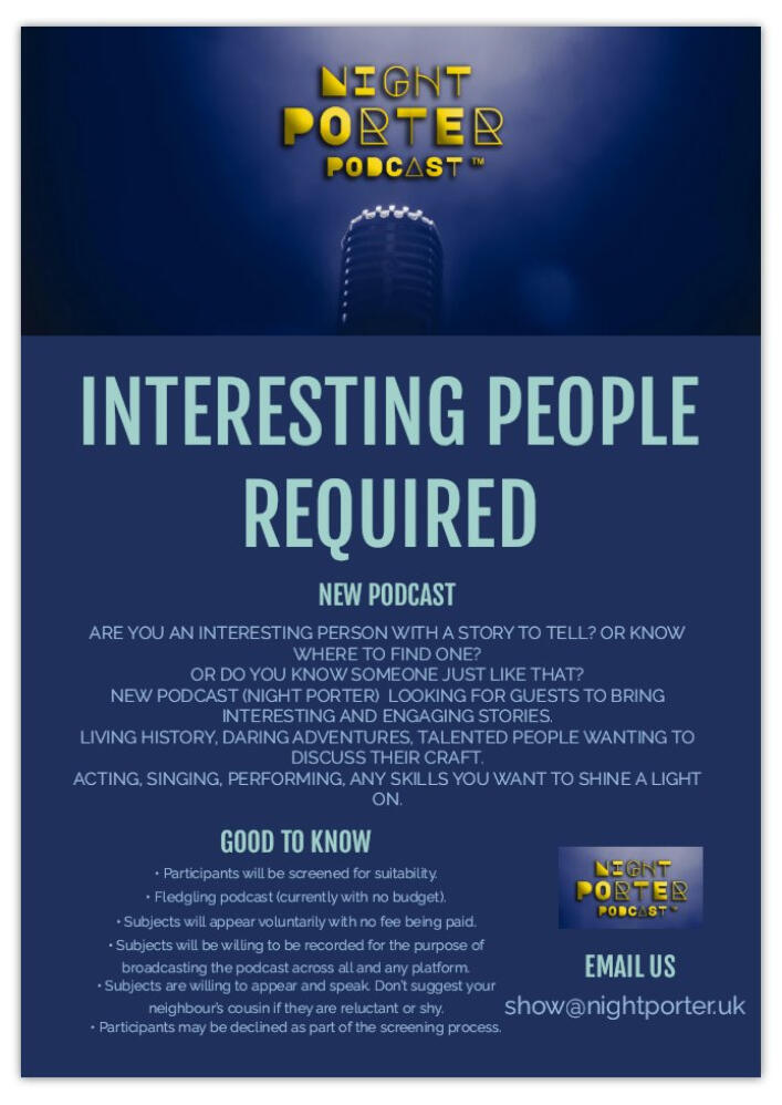 The Bombe Audio Presents NIGHT PORTER PODCAST Now casting for participants for our new podcast. The podcast can be recorded in person (preferable) or over Zoom (if outside Northern Ireland). For details see the image on the right. Email us via the link at the bottom. Podcasts are huge these days, and there's a reason for that. There's something special about being able to hear the human voice telling you stories, or sharing their thoughts on a subject. It's easy to become invested in what people are saying, or to see yourself in their stories, or just to be entertained. You don't know what to expect when you're starting a new podcast. It's an art form that is constantly evolving, and it takes a lot of trial and error to figure out what will work for your audience. Keep checking for updates.
